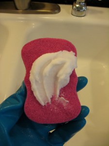 6. Slather your sponge with enough soft scrub to clean 1/2 of the sink, reserving the remainder to clean the other half. Like this: