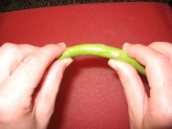 –Reach for one of the asparagus spears. Hold it horizontally with both hands, palms down. Gently begin to bend the asparagus spear toward the floor. Eventually, a small piece of the end of the spear will snap off at its natural breaking point.