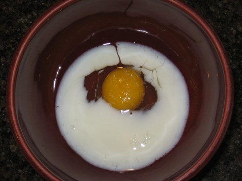 –First, break one or more eggs into a mixing bowl.