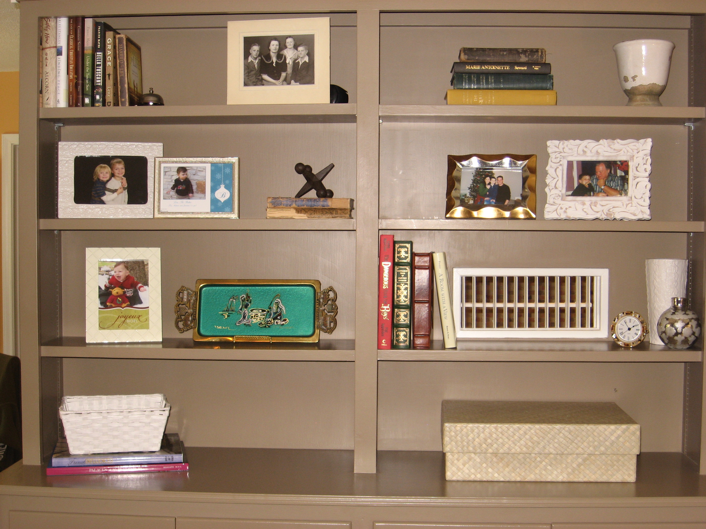 Books create balance, making the perfect backdrop for organizing pictures and other objects you wish to display. All of the books shown here were gifted or picked up for a bargain.