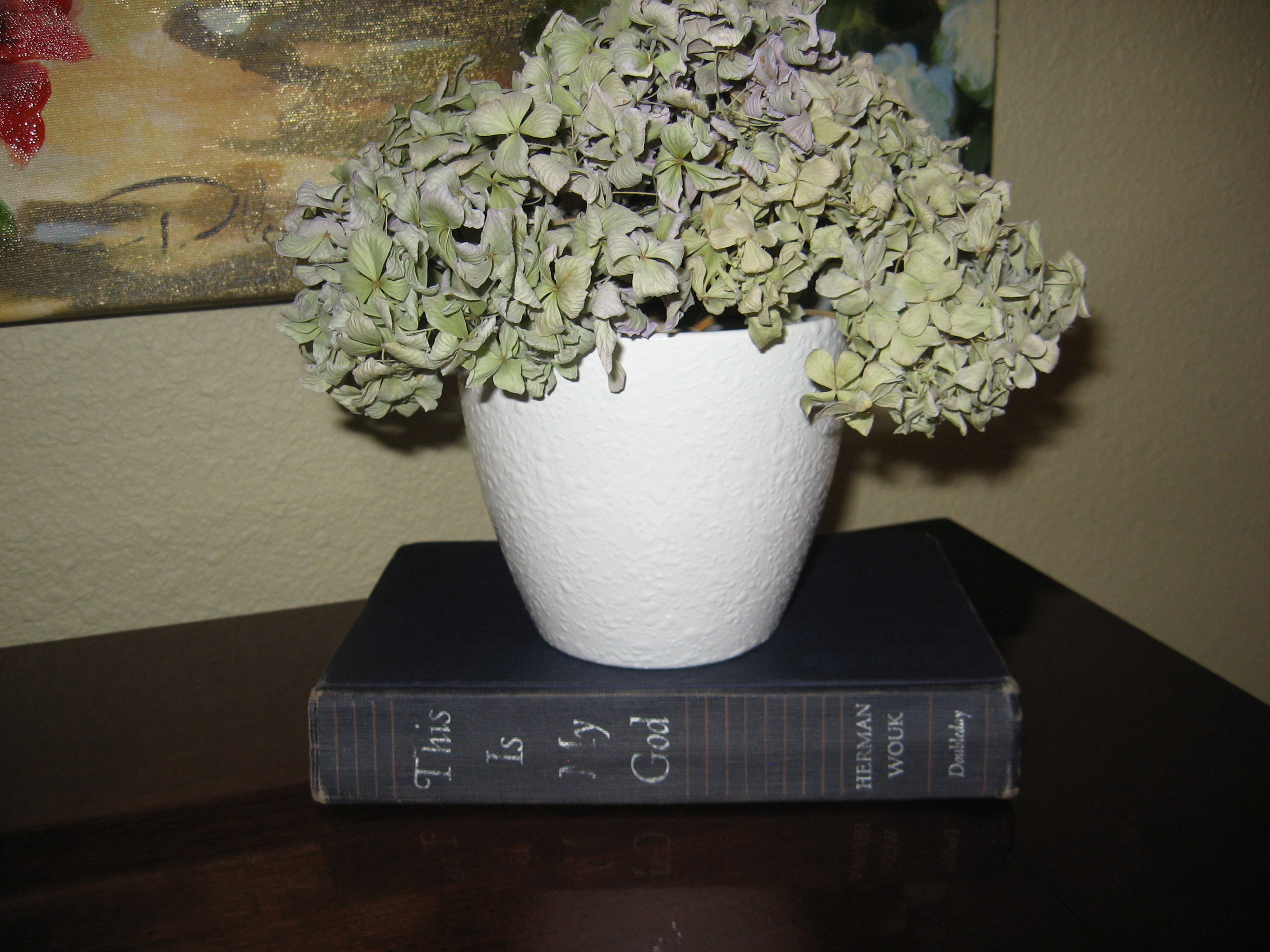 I purchased this book for $1. The hydrangeas are from my garden. I dried them and sealed them with acrylic clear coat. (I’ll be providing details on how to do this in a near-future post). I already had the flower pot, but I painted it white and sealed it with a glossy clear coat.