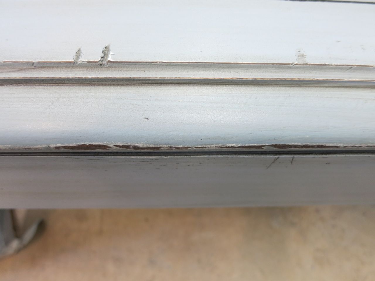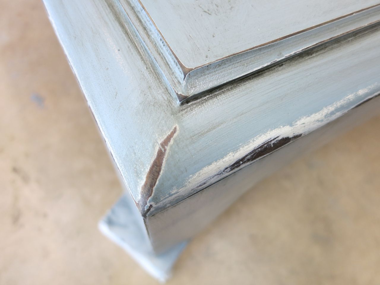 I applied pressure in areas that would incur natural wear over time. I applied Valspar Antiquing glaze using this technique to highlight the distressed areas and all the little dings and scratches.