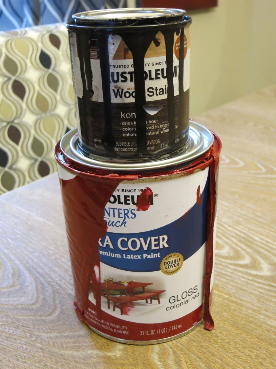 There were only two colors used, both Rustoleum products: one coat of Colonial Red paint applied with a brush, followed by one coat of Kona stain:
