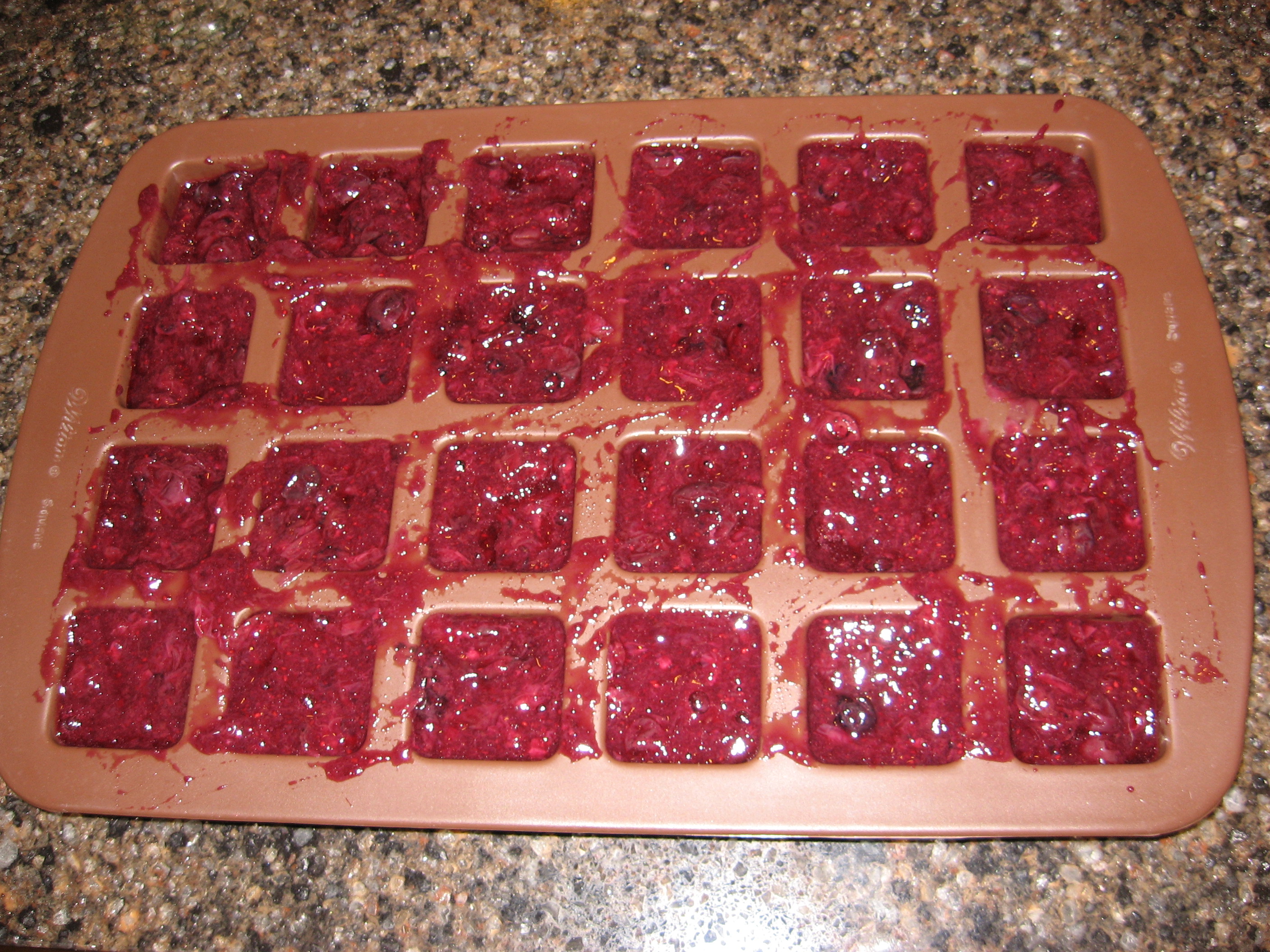 Blueberry puree before freezing in my Wilton silicone brownie mold pan
