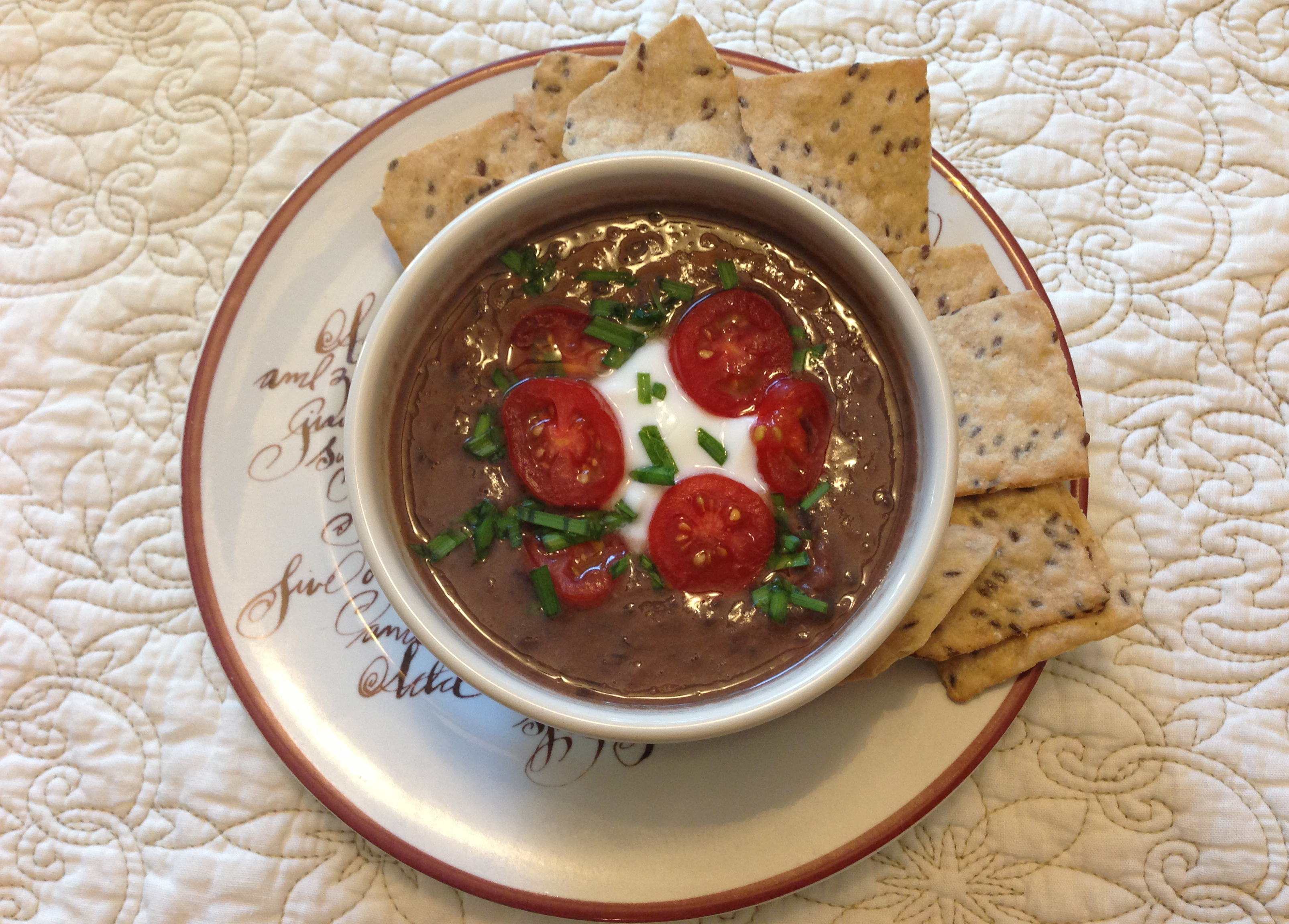 Delicious black bean soup topped with chopped grape tomatoes, plain yogurt, and fresh chives from my garden. Served alongside gluten-free brown rice crackers by Food Should Taste Good, purchased at Costco.